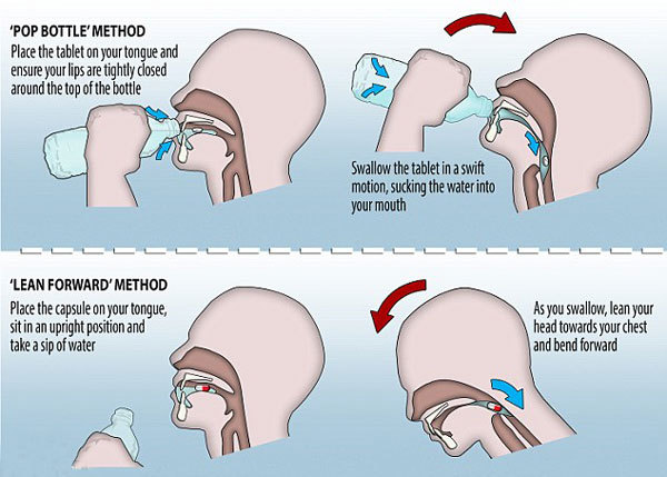 所谓“汽水瓶法”,是先装满一塑料瓶水,把药片放在舌头上,然后用嘴唇夹紧瓶口,开始喝水,顺势把药片带下去。